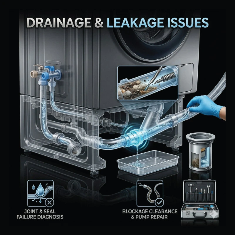 We help resolve common problems like water not draining properly, water leakage, blocked outlets, and related washing machine performance issues.